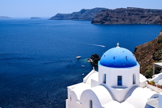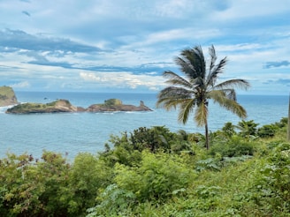 a palm tree on a hill overlooking a body of water